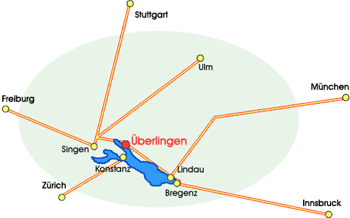 Überlingen liegt am Nordufer des Bodensees, dem sogenannten Überlinger See. Der nächstgelegene Flughafen zu Überlingen ist Friedrichshafen und liegt ca. 40 km entfernt. Von dort aus können Sie per Zug oder mit dem Schiff nach Überlingen weiterreisen. Der Bahnhof von Überlingen liegt nur wenige Fahrminuten von der Ferienwohnung entfernt. Die Anreise mit dem Auto ist dank des hervorragend ausgebauten Straßennetzes rund um den Bodensee von allen Richtungen her sehr bequem. Wie auch immer Sie anreisen, wir wünschen Ihnen schon heute eine gute und sichere Anfahrt nach Überlingen.